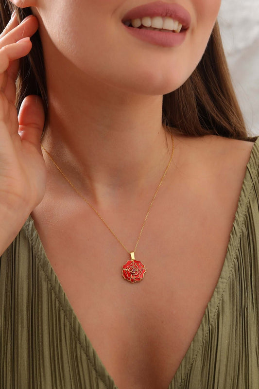 Kırmızı Taşlı 925 Ayar Gümüş Lotus Çiçeği Kolye
