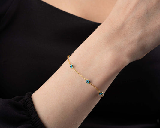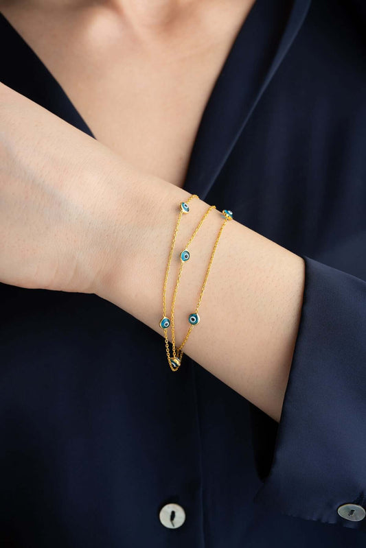 925 Ayar Gümüş Altın Kaplama Üçlü Nazar Boncuklu Bileklik