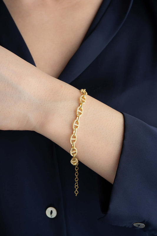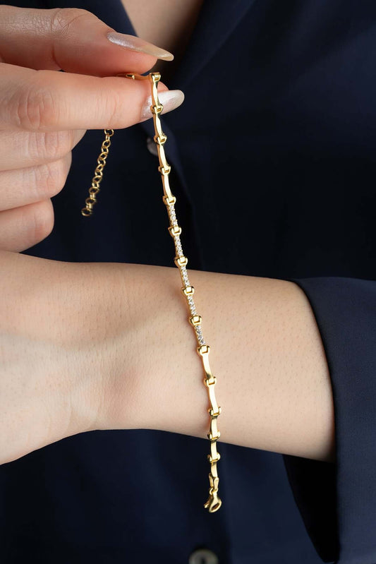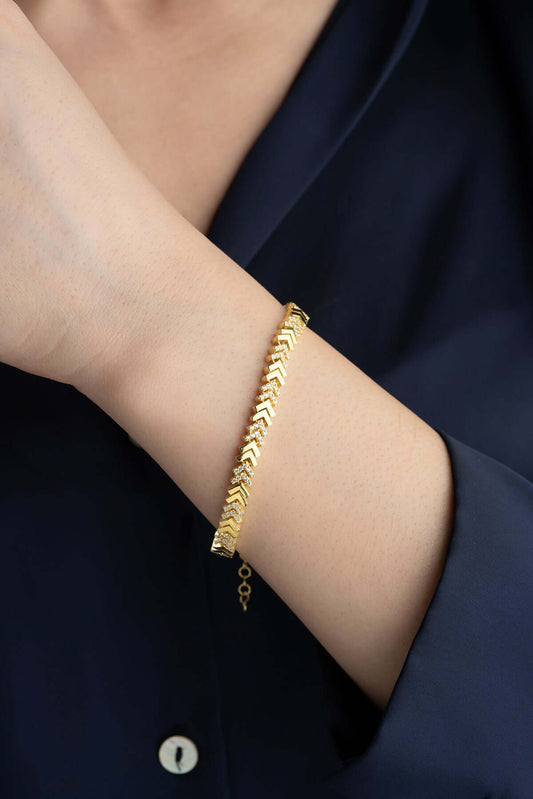 925 Ayar Gümüş Zirkon Taşlı Altın Kaplama Balık Sırtı Bileklik