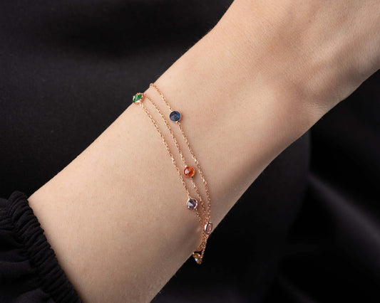 Renkli Taşlı Üç Zincirlik 925 Ayar Gümüş Bileklik