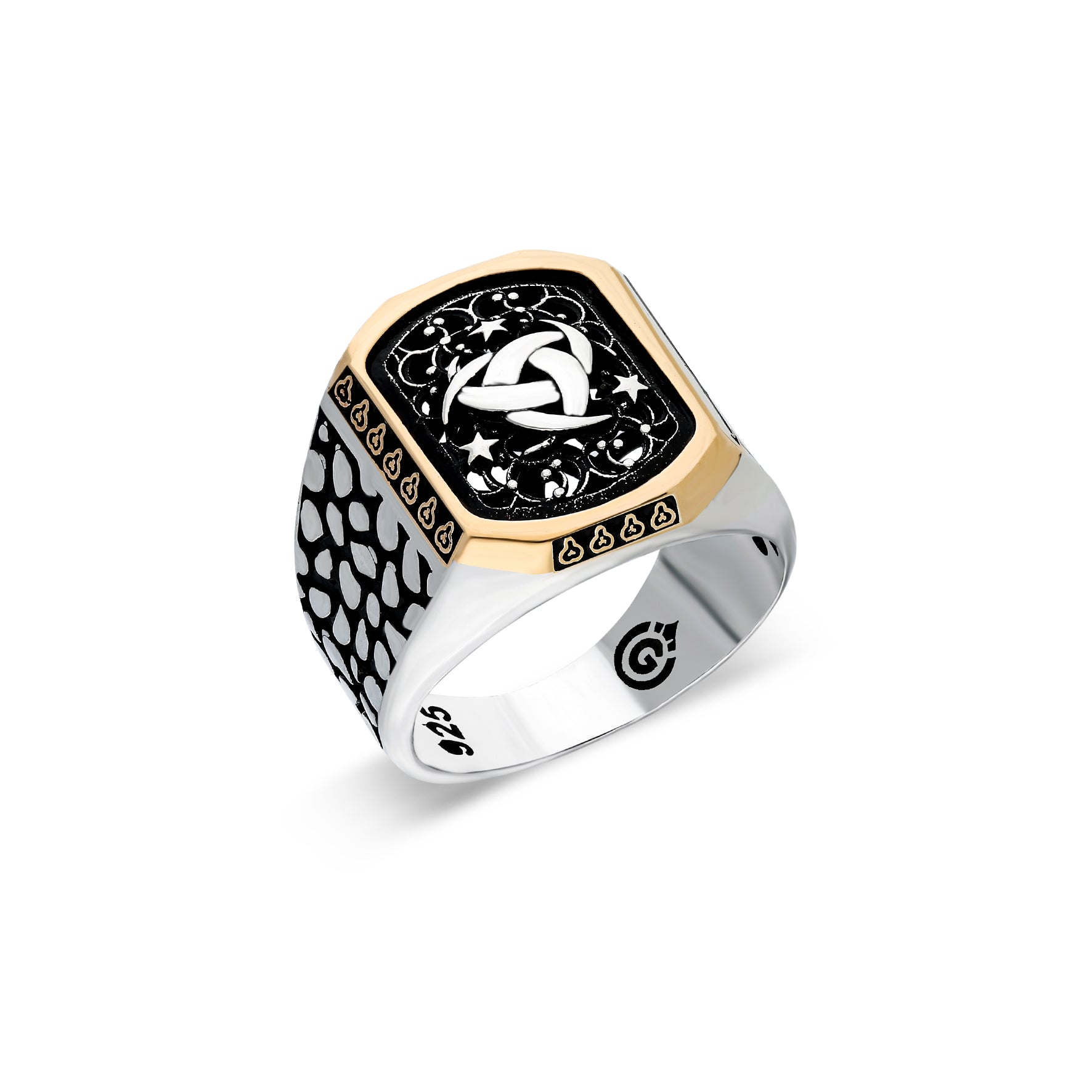 Bu teşkilatı mahsusa yüzük modelinin en ayırt edici özelliği, yan yüzeydeki titizlikle işlenmiş pul/petek dokusudur. Bu detay, yüzüğün karizmasını artırırken, dokunsal bir zenginlik sunar. Merkezi süsleyen Teşkilat düğümü, karanlık mine zemin üzerinde yüzer gibi durur; bu, sadakatin zorlu koşullar altında bile parladığını simgeler.